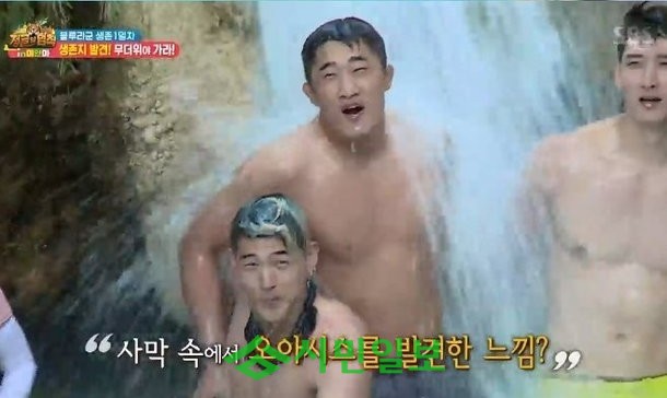 상의를 모두 탈의한 문성민은 "오랫동안 샤워를 못 했는데 오랜만에 물에 들어가니 천국 같았다"고 말했다. 이를 본 김동현도 자신의 다부진 몸매를 뽐내기 위해 상의를 탈의했다. 그러나 그의 가슴엔 밴드가 붙어져 있어 눈길을 끌었다.