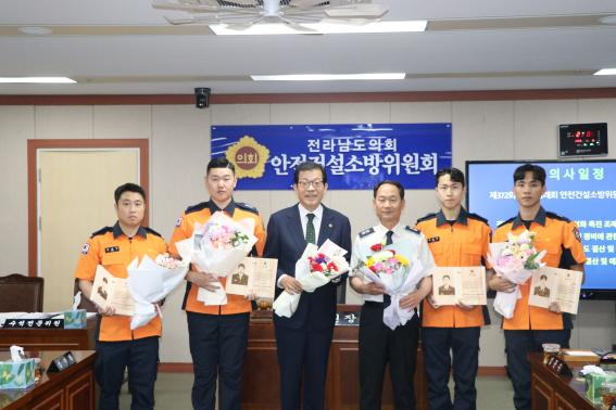 [남악=황승순 기자]전라남도의회 안전건설소방위원회(위원장 이동현)는 지난 2일 축구대회 경기 중 쓰러진 도민을 심폐소생술로 소생시킨 여수소방서 소방교 정현균, 소방사 권석현, 소방사 남승민, 소방사 송창훈 4명에게 감사패를 전달했다.