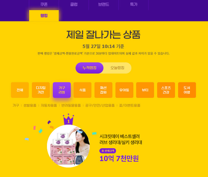 [시민일보 = 이승준 기자] 여성용품 전문 브랜드 시크릿데이가 지난 16일부터 시작된 대한민국 쇼핑 축제 지마켓 빅스마일데이에서 판매 랭킹 1위를 기록했다.