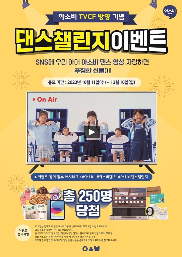 한편, 댄스 챌린지 외 ▲상담 신청 이벤트 ▲소문내기 이벤트를 진행한다. 자세한 내용은 아소비 공식 홈페이지 및 공식 SNS를 통해 확인할 수 있다.