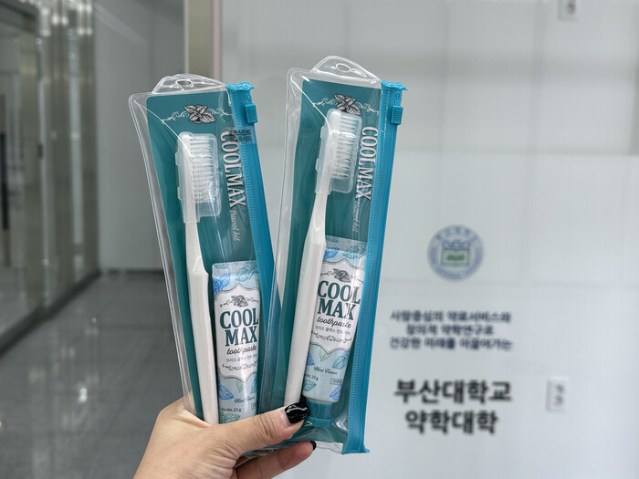 이번 프로젝트는 약학관 내 국가고시 준비실에서 시험 막바지 공부에 열중하는 부산대 약대 6학년 학생 전원을 대상으로 진행했다. 응원물품으로 준비한 크리오 쿨맥스 휴대용 칫솔·치약 세트을 학생들에게 전달하고 응원의 메시지를 전했다.