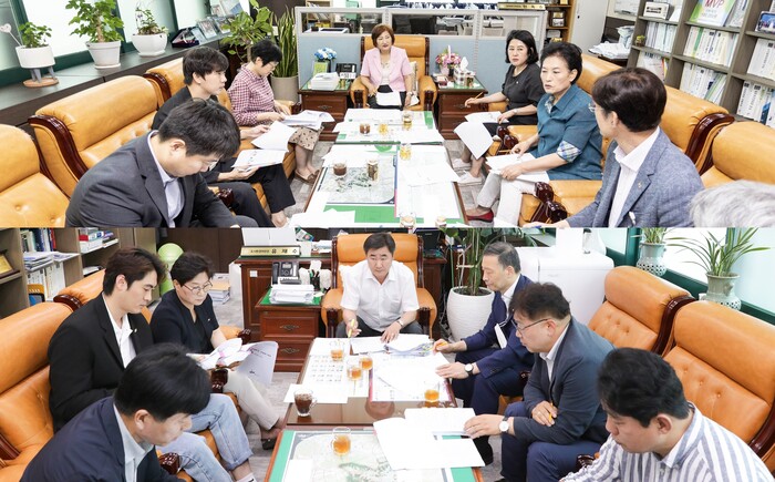 | 안산시의회 문화복지위원회(사진 위)와 도시환경위원회가 16일 안산시 집행부와 간담회를 개최했다. (사진제공=안산시의회)