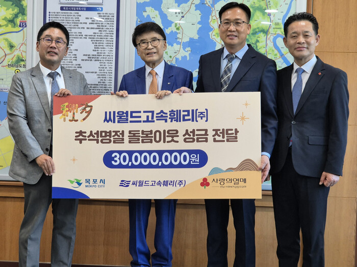 [목포=황승순 기자]씨월드고속훼리(주)(회장 이혁영)는 민족 최대 명절인 추석을 맞아 9월 23일(화) 오후 2시 목포시청을 방문해 목포시에 불우이웃돕기 성금 3천만원과 목포시 인재육성장학재단에 장학금 1천만원을 기탁했다.