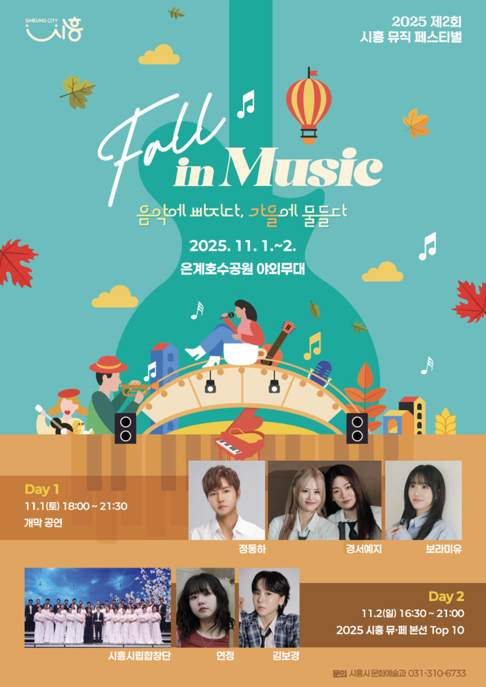 이번 대회는 ‘시흥 폴 인 뮤직(Fall in Music) 음악에 빠지다, 가을에 물들다’라는 주제로 총 21일간 전국 단위 다양한 장르의 참가팀을 모집했다. 서류 및 연주영상 심사 후 15개 팀이 오는 10월 26일 목감 산현공원에서 열리는 예선전에 진출한다. 이어 11월 2일 열리는 본선 무대에는 최종 10개 팀만이 참가 자격을 얻어 6개 팀이 최종 수상 팀으로 선정될 예정이다.