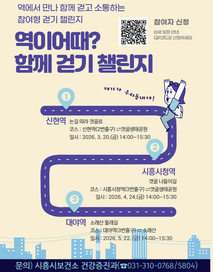 이형정 시흥시보건소장은 “일상과 가까운 지하철역을 중심으로 누구나 쉽게 참여할 수 있는 걷기 프로그램을 마련했다”라며 “걷기를 통해 시민들이 건강을 증진하고 이웃과 소통하는 뜻깊은 시간이 되길 바란다”라고 말했다.