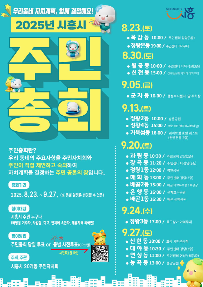 각 동 주민총회 일정은 ▲8월 23일 목감동, 정왕본동 ▲8월 30일 신천동, 월곶동 ▲9월 5일 군자동 ▲9월 13일 정왕2동, 정왕4동, 거북섬동 ▲9월 20일 은행동, 매화동, 정왕1동, 배곧1동, 배곧2동, 과림동, 장곡동 ▲9월 24일 정왕3동 ▲9월 27일 대야동, 신현동, 능곡동, 연성동 순으로 진행된다.