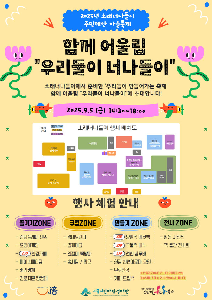 축제는 ‘즐기기ㆍ쿠킹ㆍ만들기ㆍ전시’ 등 총 4개 존(ZONE)으로 운영된다. ▲랜덤플레이 댄스 ▲오징어게임 ▲아동ㆍ성인 요리 수업 ▲진로 탐험 등의 프로그램이 마련되며 ▲양말목 에코백 ▲주물럭 비누 제작 ▲천연 샴푸바 만들기 등 친환경 체험을 즐길 수 있는 ESG 실천 부스가 운영된다.