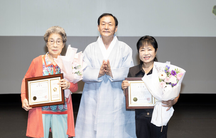 | ▲ 안산시의회가 15일 제79주년 광복절을 맞아 광복회 안산시지회 소속 유공자 안인자, 조경희 님을 표창했다. 사진 가운데가 박태순 의장이고 왼쪽이 안인자 님, 오른쪽은 조경희 님의 모습 /사진제공=안산시의회 |