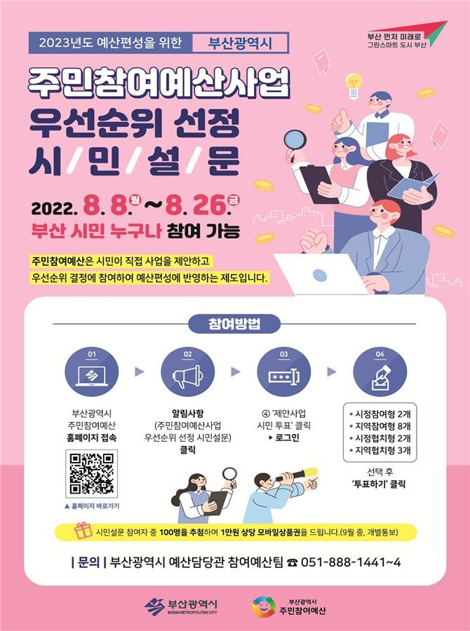 [부산=조병선 기자] 부산시(시장 박형준)는 내년도 주민참여예산사업 선정을 위한 ‘시민 설문조사’를 오는 26일까지 진행한다고 밝혔다.