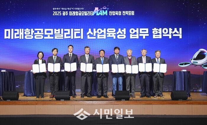 | ▲ 강기정 광주광역시장(사진 가운데)이 4일 오후 서구 김대중컨벤션센터에서 열린 ‘2025 미래항공모빌리티(AAM) 산업육성 전략 포럼’에 참석해 8개 기업‧기관과 미래항공모빌리티 산업육성 업무협약을 체결하고 있다./광주광역시 제공 |