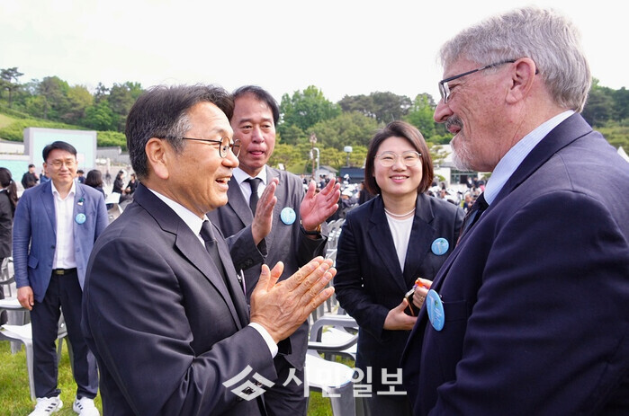 | ▲ 강기정 광주광역시장이 18일 오전 국립5·18민주묘지에서 열린 '제45주년 5·18민주화운동 기념식'에서 5·18민주화운동 당시 시민군으로 참여한 미국인 '데이비드 돌린저(David Lee Dolinger, 한국명 임대운)'씨와 만나 인사를 나누고 있다./광주광역시 제공 |