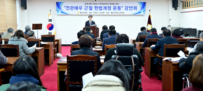 [목포=황승순 기자]목포시의회는(의장 문차복)는 2024년 청룡의 해를 맞아 시민의 참 뜻을 대변하는 열린 의회로 거듭나기 위해 1월 25일 목포시민, 목포시의회 의원을 비롯 의회사무국 직원을 대상으로 “전관예우 근절 헌법개정 운동” 주제로 강연회를 개최했다.