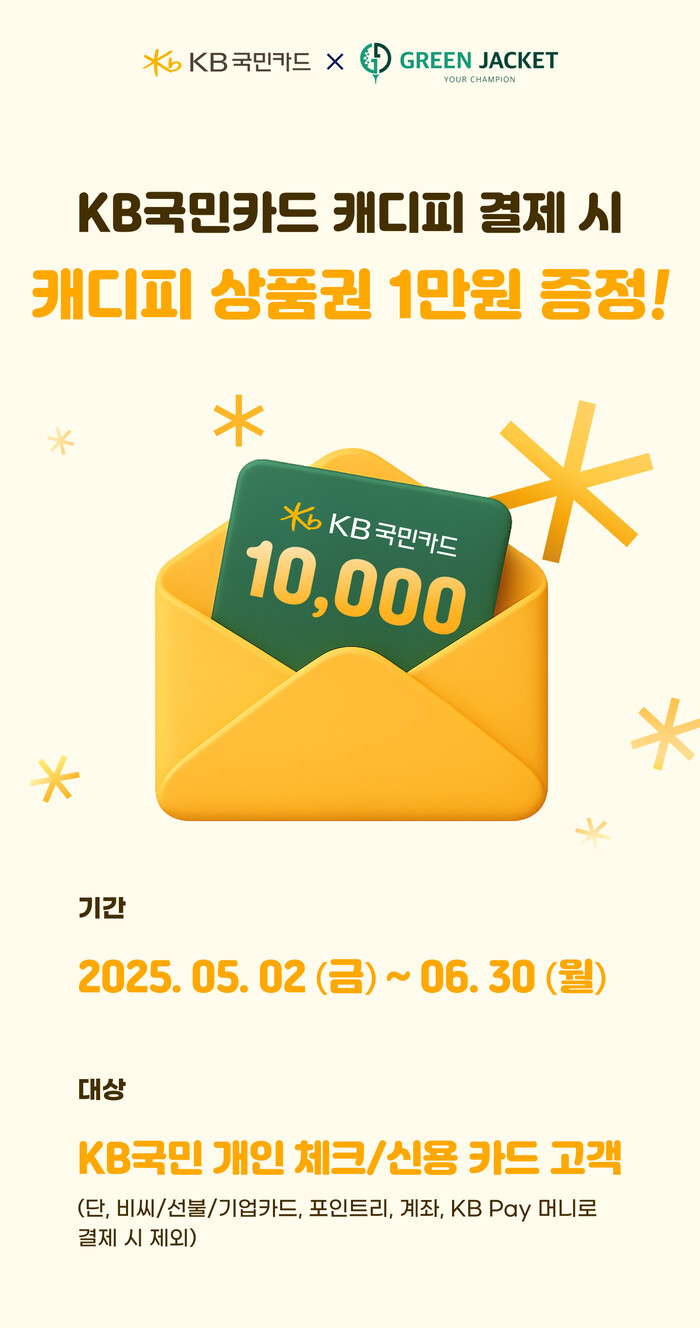 그린재킷 제휴 골프장에서 KB국민카드로 3만 원 이상 캐디피를 결제하면 1만원 캐디피 상품권이 제공되며, 4인 1팀 기준으로 캐디피 15만 원의 캐디피를 각 자 4명이 KB 카드로 결제하면 최대 4만 원의 상품권을 증정하는 통 큰 이벤트로 오는 6월 30일까지 진행된다. 비씨, 선불, 기업카드, 포인트리, 계좌, KB Pay머니 결제는 제외되며, 단 예산소진 시 조기 종료될 수 있다.