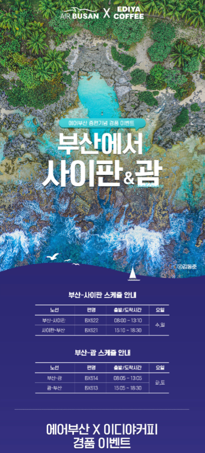 에어부산(대표 안병석)이 부산에서 출발하는 사이판과 괌 노선 증편 기념으로 이디야커피와 함께 경품 증정 이벤트를 실시한다.