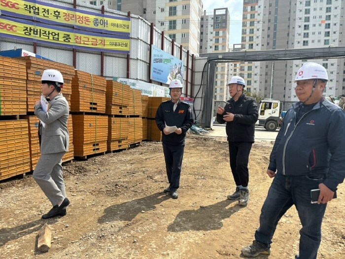 | ▲ 한충현 해남소방서 소방장(가운데)이 유관기관 관계자 등과 지난 8일 관내 대형 아파트 공사현장을 찾아 합동 화재안전조사를 실시하고 있다. / 해남소방서 제공 |