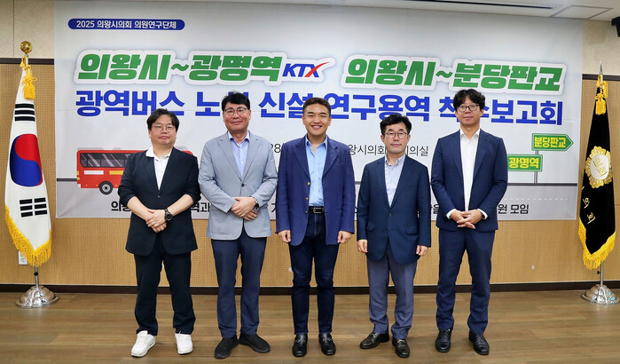 이날 보고회는 의왕시에서 광명역과 분당판교로 가는 광역버스 노선 신설 추진 방안을 연구하는 의원 모임의 한채훈 대표의원과 서창수, 김태흥 의원과 연구용역 수행기관인 (사)대한교통학회 강진동 책임연구원, 김태균 선임연구원 등이 참석했다.