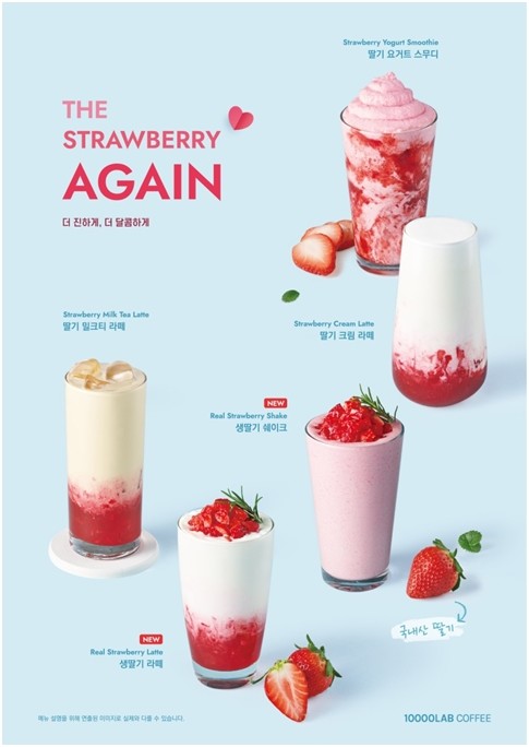 이번 신메뉴 ‘THE STRAWBERRY AGAIN’은 △생딸기 라떼 △생딸기 쉐이크 △딸기 크림 라떼 △딸기 밀크티 라떼 △딸기 요거트 스무디 5종 음료로 골라 먹는 재미를 더했다.