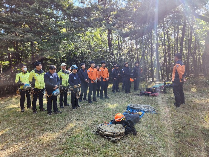 | ▲ 강진소방서, 지난 23일 월출산국립공원 일대에서 가을철 증가하는 산악사고에 대비한 국립공원공단관계자와 함께 합동 인명구조훈련 실시 / 강진소방서 제공 |