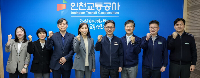 | 인천교통공사와 인천병무지청간 간담회 참가자들이 화이팅을 외치고 있다. [사진=인천교통공사 제공] |