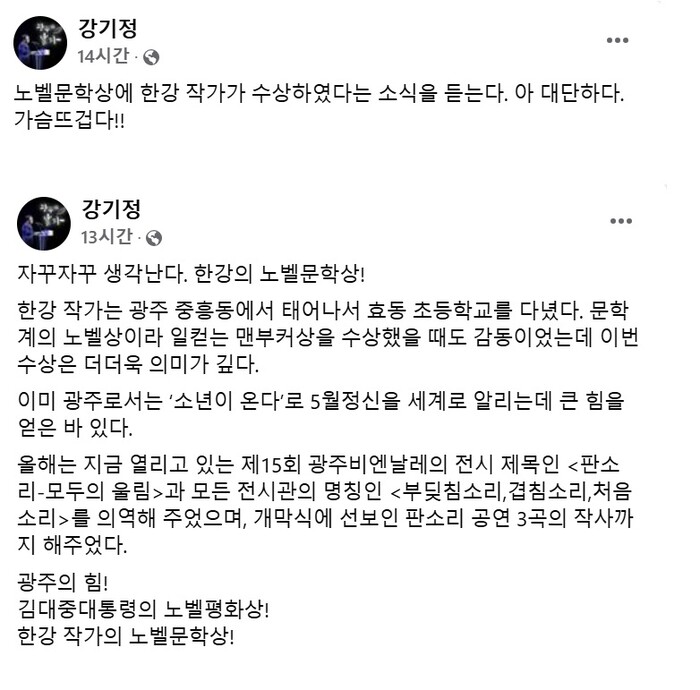 강 시장은 이날 페이스북에 “한강 작가는 광주 중흥동에서 태어나서 효동초등학교를 다녔다”며 “문학계의 노벨상이라 일컫는 맨부커상을 받았을 때도 감동이었는데, 이번 수상은 더더욱 의미가 깊다”고 축하했다.
