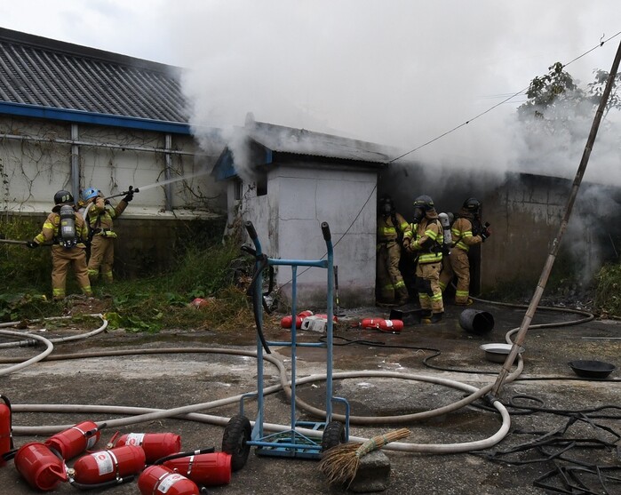 | ▲ 강진소방대원들이 관내 한 농가의 주택 창고 화재 현장에서 초기 화재에 사용한 소화기 사용 후 잔불 진화를 하고 있다. / 강진소방서 제공 |