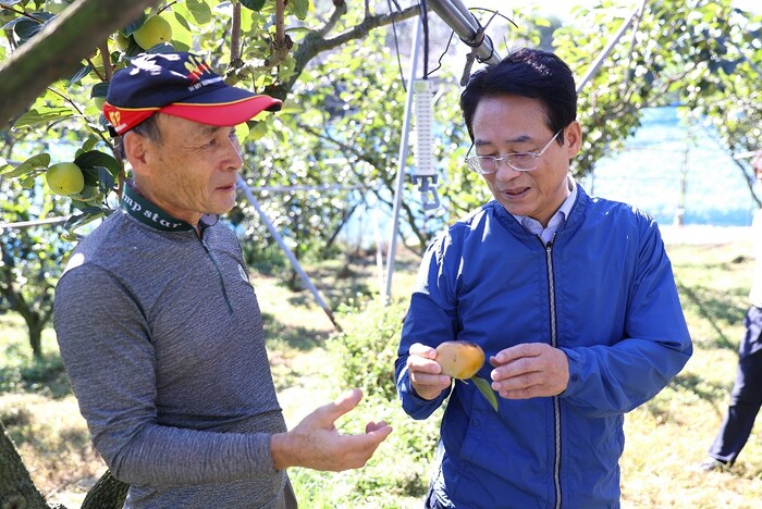 | ▲ 강진원 강진군수(오른 쪽)가 지난 19일 강진읍 춘곡마을 단감 햇볕데임 피해를 입은 농가를 찾아 농업인과 대화를 나누고 있다. / 강진군 제공 |