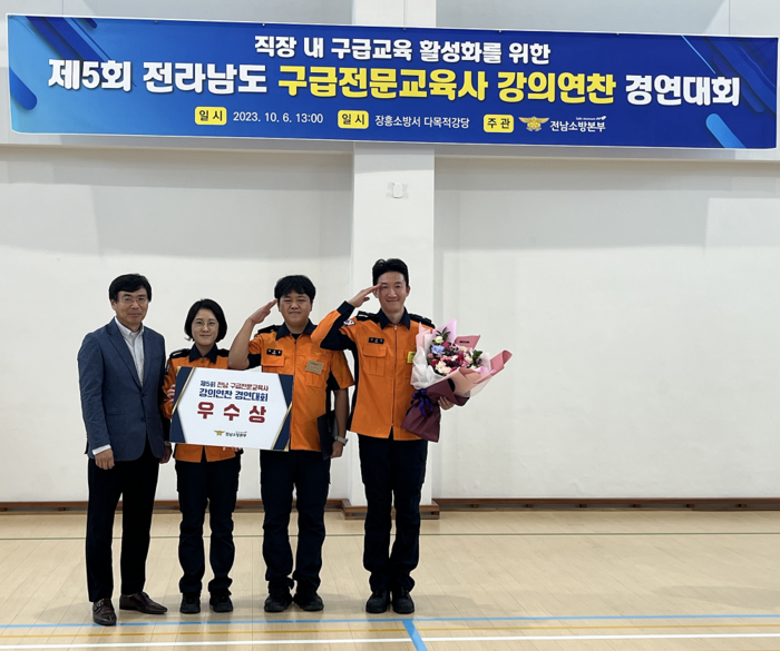 전남 소방본부 주관으로 진행된 이번 대회에 강진소방서 소방위 김수재, 소방장 정재석, 최선영, 소방사 박민영이 대표로 나선 가운데 Pre-KTAS(병원 전 응급환자 중증도 분류) 교육안으로 강의내용 및 강의전개의 체계성 등을 발표해 높은 평가를 받았다.