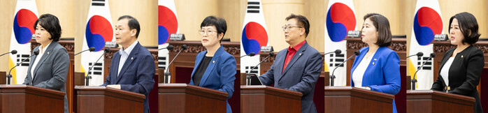 | 안산시의회가 14일 제284회 임시회 제2차 본회의를 열고 시정질문과 5분 자유발언을 실시했다. 사진 왼쪽부터 이날 시정질문과 5분 발언을 진행한 김진숙 박태순 박은경 이대구 박은정 황은화 의원의 모습. (사진제공=안산시의회) |