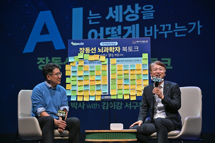 [광주=정찬남 기자] 김이강 광주 서구청장(오른 쪽)이 지난 6일 서빛마루문화예술회관에서 열린 ‘장동선 작가 북토크’에서 장동선 박사와 함께 북토크를 갖고 있다. 광주 서구 제공