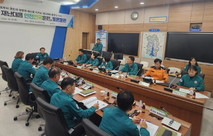 | ▲ 강진군, 31일 군청 재난종합상황실에서 유관기관 등과 '2024년 재난 대응 안전한국훈련 통합 훈련' 실시 / 강진군 제공 |