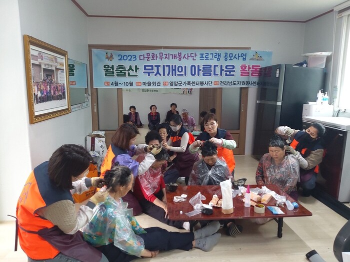| ▲ 영암군가좃센터봉사단, 지난 18일 삼호읍 서창마을 지역주민 대상 머리 염색 자원봉사 활동 / 영암군 제공 |