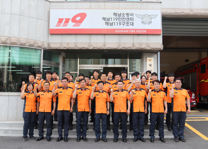 | ▲ 오승훈 전남소방본부장, 지난 14일 해남소방서 방문 최진석 해남소방서장 및 직원들과 기념촬영 / 해남소방서 제공 |