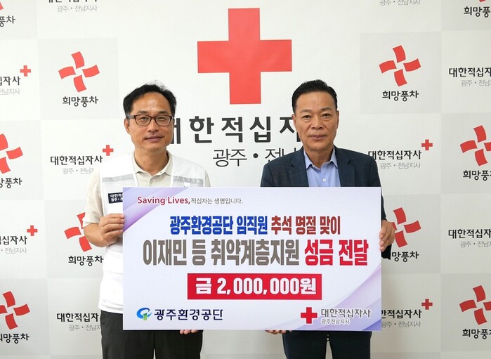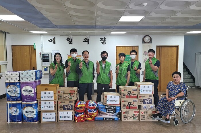 광주환경공단은 추석을 맞아 주변의 어려운 이웃들을 위해 대한적십자사에 200만 원의 성금을 기부하고 사회복지시설 ‘애일의 집’을 찾아 100만 원 상당의 생필품을 전달했다.