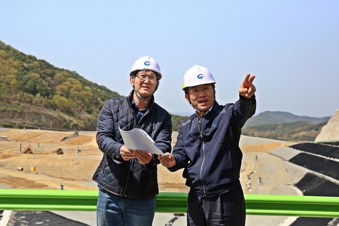 | ▲ 김성환 광주환경공단이사장(오른 쪽)이 최근 공사가 완료된 광역위생매립장 2-2단계 시설을 사전 점검 하고 있다. / 광주환경공단 제공 |