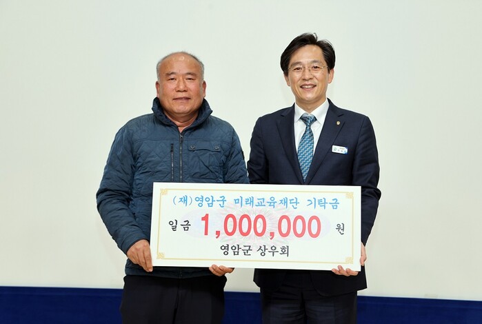 4일 영암 전통시장 상인단체인 영암군상우회(회장 강영구)가 (재)영암군미래교육재단에 장학기금 100만 원을 기탁했다.