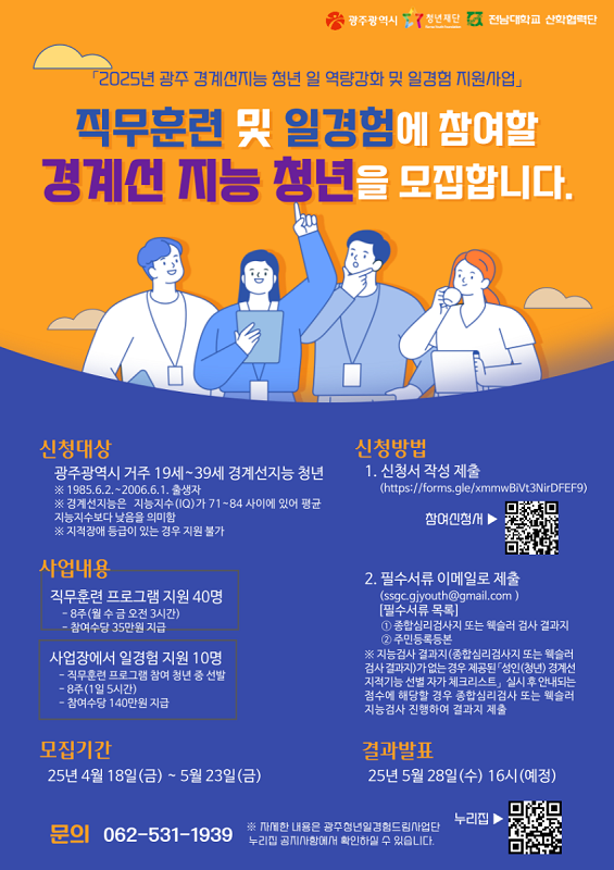 광주광역시(시장 강기정)는 청년재단, 전남대학교 산학협력단과 손잡고 경계선지능 청년들에게 일경험 기회를 제공하는 ‘경계선지능 청년 일역량 강화 지원 시범사업’을 추진, 오는 5월23일까지 희망자를 모집한다.