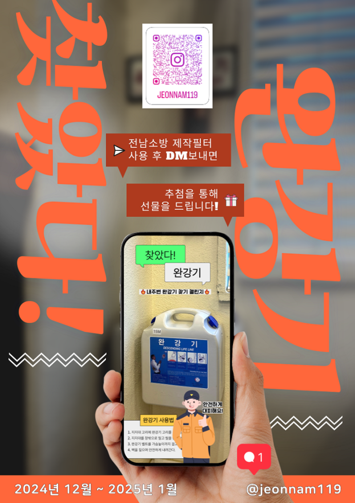 이벤트에는 군민 누구나 참여할 수 있다. 인스타그램에서 카메라를 실행한 후 ‘전남소방’ 필터를 검색해 주변 완강기를 촬영하고 사용 방법을 확인한 뒤 이를 전남소방 공식 계정으로 DM(다이렉트 메시지)을 보내면 된다.
