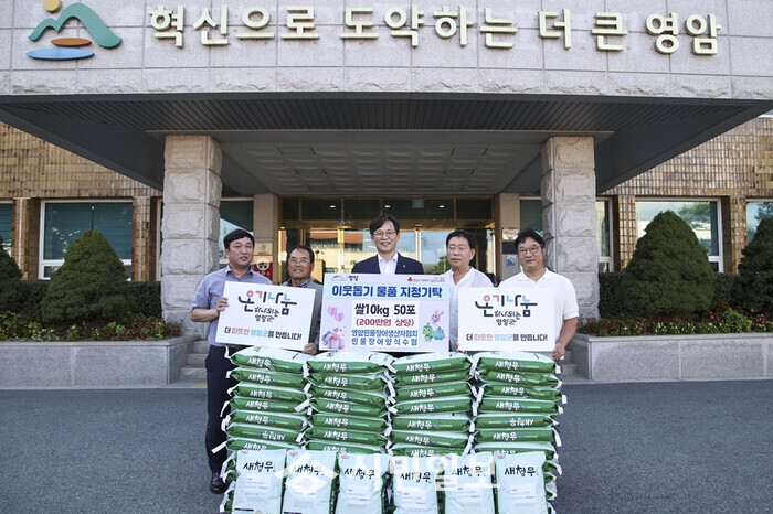 | ▲ 우승희 영암군수(사진 가운데)가 지난 3일 군청사 입구에서 민물장어생산자협회 영암군지회, 민물장어양식수협으로부터 지역 취약계층 돕기 200만 원 상당의 10kg 쌀 50포를 기탁 받고 관계자 등과 기념촬영을 하고 있다 / 영암군 제공 |