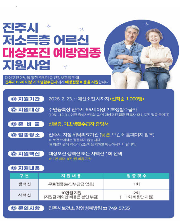 지원 대상은 접종일 기준 진주시에 주소를 둔 65세 이상(1961년 12월 31일 이전 출생) 기초생활수급자이며, 과거 대상포진 예방접종 완료자와 백신 접종 금기자는 제외된다.