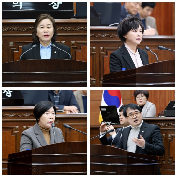 | ▲ (왼쪽 상단부터 시계방향으로) 김은하, 정유나, 신동철, 김효숙 의원이 구정질문을 하고 있다.(사진=동작구의회 제공) |
