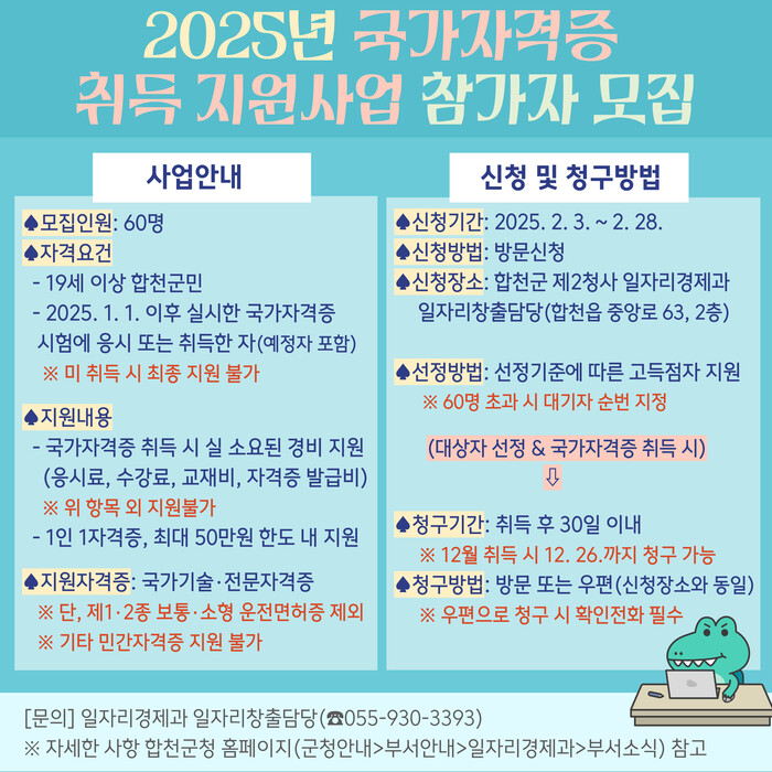 한호상 일자리경제과장은 “국가자격증 취득 지원사업을 통해 기업과 개인의 구인·구직 기회가 확대되고, 자격증 취득을 통해 더욱 당당하고 보람차게 일할 수 있는 합천군이 되기를 기대한다”며 합천군민의 행복한 미래를 위해 지원을 아끼지 않겠다고 밝혔다.
