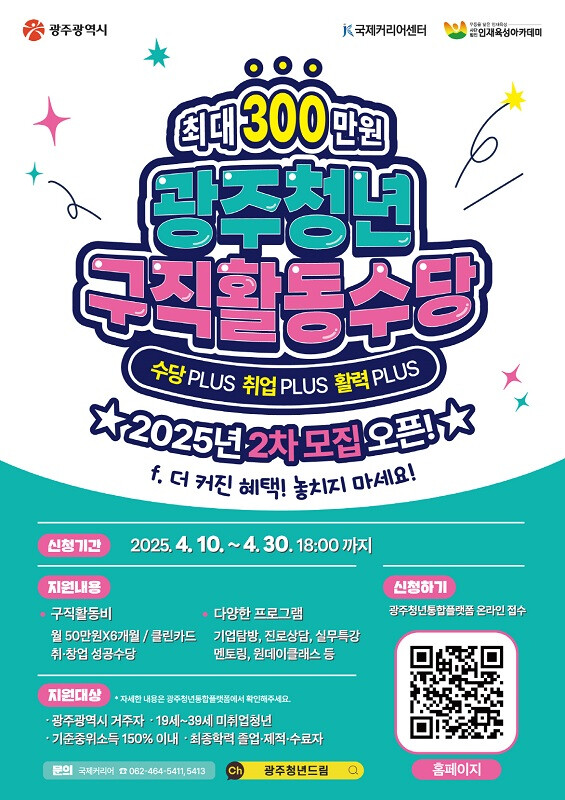 선정 결과는 5월중 광주청년통합플랫폼 마이페이지 또는 문자 메시지로 개별 통보한다. 최종 대상자는 온라인 예비교육 이수와 청년구직활동수당 지급을 위한 클린카드 발급 절차 등을 이행하면 된다.