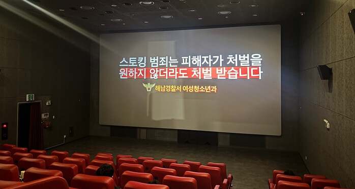 | ▲ 해남경찰서, 해남시네마 본 영화 상영 전 전남경찰청&전남자치경찰위원회 제작 스토킹 범죄예방 광고 영상 송출 이미지 / 해남경찰서 제공 |