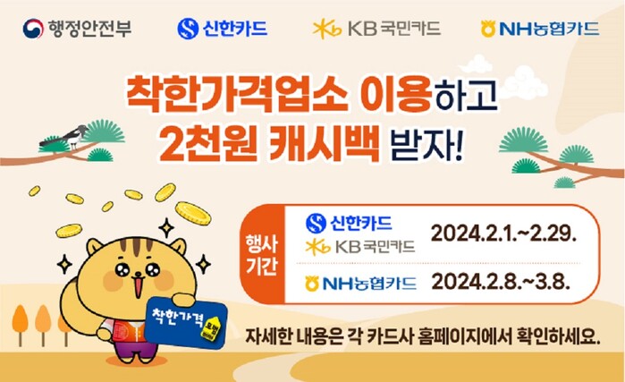 이와 함께 신한·롯데·비씨·삼성·우리·하나·현대·KB국민·NH농협 등 국내 9개 신용카드사와 협력해 착한가격업소에서 1만원 이상 카드 결제 때 1회당 2000원 할인 혜택도 받을 수 있다.