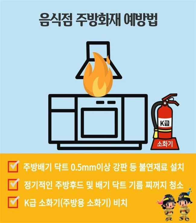 음식점 주방 화재 예방을 위한 주요 수칙은 다음과 같다. ‘주방 배기 덕트에 0.5mm 이상의 불연재 강판을 설치해 화재 확산을 막기’, ‘정기적으로 주방 후드와 배기 덕트의 기름 찌꺼기 청소를 통해 화재 위험 요인을 제거하기’, ‘주방용 K급 소화기를 비치해 기름 화재에 신속하게 대응하기’ 등이다.