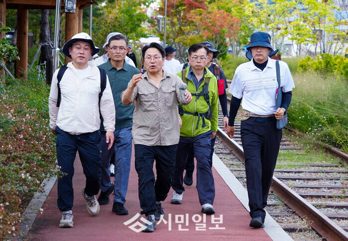 | ▲ 강기정 광주광역시장이 지난 2024년 9월 28일 오후 2시 도시철도 2호선 1단계 구간 친환경 녹색도로 조성을 위한 박필순, 최지현 광주시의회 의원, 시민단체, 관계공무원 등과 남구 푸른길공원 일대에 대한 현장답사를 하고 있다. / 광주광역시 제공 |
