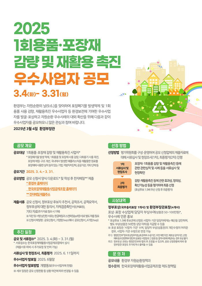 이번 공모는 자원순환의 날(9월 6일)을 맞아 포장 폐기물 발생 억제, 1회용품 사용 감량, 재활용 촉진 등에 기여한 우수사업자를 발굴하고 포상하기 위해 마련됐다.