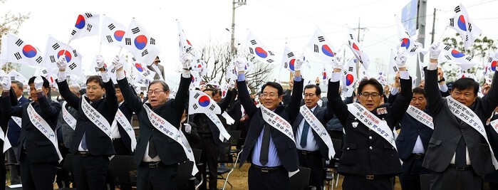 | ▲ 강진원 강진군수(앞줄 오른 쪽부터 세 번째)가 지난 4일 남포마을 3.1운동기념탑 앞에서 105주년 ‘강진4.4독립만세운동 기념식’에서 참가자들과 함께 ‘만세삼창’을 하고 있다. / 강진군 제공 |