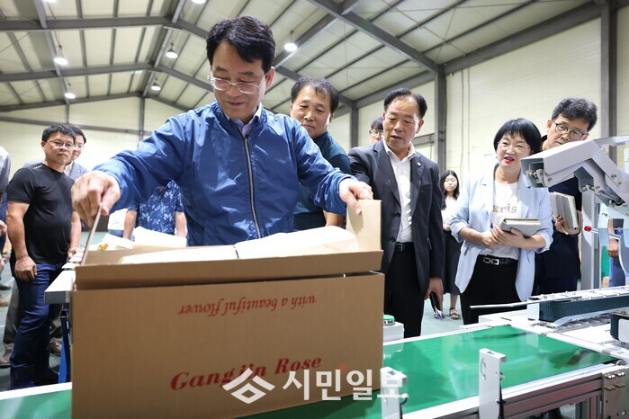 | ▲ 강진원 강진군수가 장미 직거래용 포장박스 자동화 시스템을 이용한 ‘제함기’ 시연을 하고 있다. / 강진군 제공 |