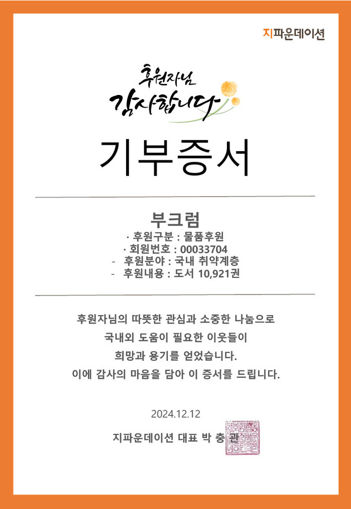 이번 기부는 지역사회 독서문화 확산과 국내 문화소외계층에 대한 지원을 위해 기획됐다. 부크럼은 2020년부터 지파운데이션과 동행하며, 다양한 사회공헌활동으로 선한 영향력을 펼치고 있다.